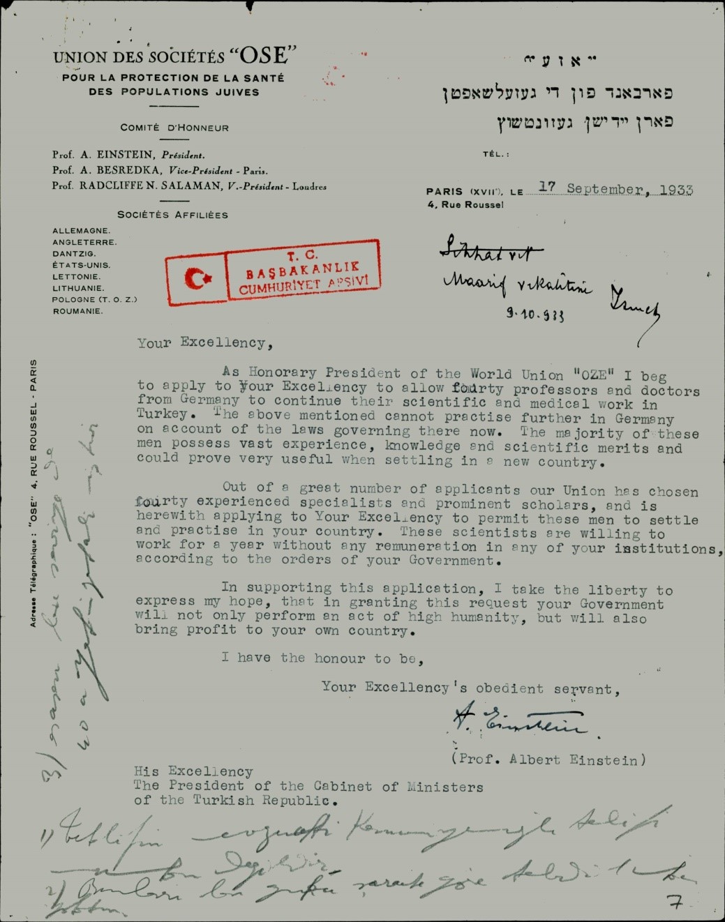 Albert Einstein could not stand the Nazi pressure, which made his life and career difficult, and moved to Paris. However, the Jewish professors in Germany were still not safe. These valuable and experienced people were looking for a safe country to take shelter in. For this very reason, a letter signed by Albert Einstein was sent to the Prime Ministry of the Turkish Republic on September 17, 1933.