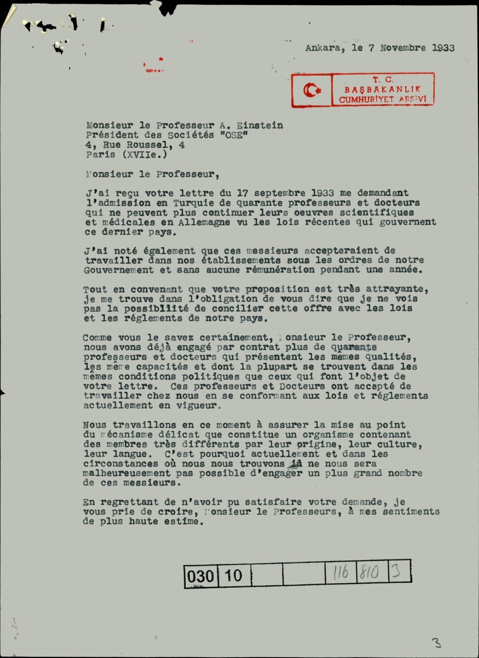 The Prime Minister of the time, İsmet İnönü, read this letter and sent the letter to the Minister of National Education, Reşit Galip Bey, who was serving at that time. But the result was negative. And İsmet İnönü sent the following reply letter to Einstein: